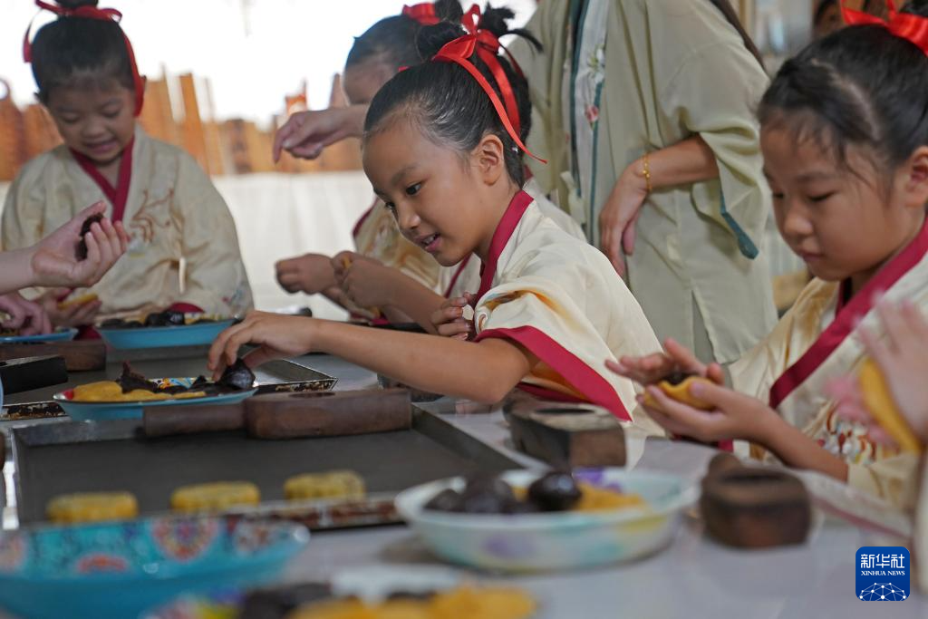 9月11日,孩子們?cè)诨顒?dòng)上體驗(yàn)傳統(tǒng)手工月餅制作。新華社記者 萬象 攝