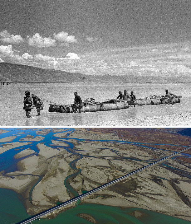 ↑拼版照片:上圖是20世紀(jì)50年代,雅魯藏布江上游的牛皮船載著土特產(chǎn)和糧食沿江運輸至西藏東部(新華社發(fā)趙奇攝);下圖是2016年12月11日拍攝的位于西藏山南市扎囊縣境內(nèi)的扎囊特大橋(新華社記者 普布扎西 攝)。