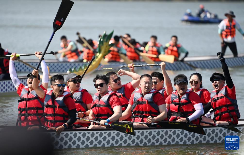 當(dāng)日,“國家非遺道州龍船傳統(tǒng)賽”在湖南永州道縣瀟水河水域開賽,吸引了當(dāng)?shù)亟?00支龍舟隊5000余人同臺競技,奮楫競渡,迎接端午節(jié)的到來。