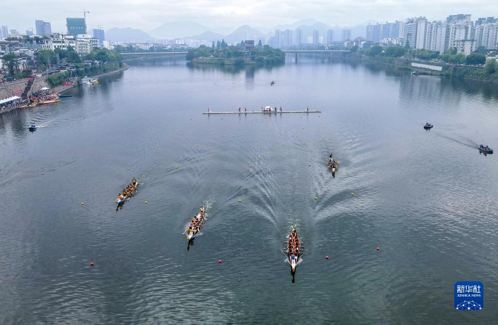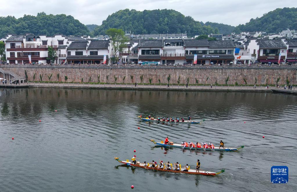 6月18日,龍舟隊在安徽省黃山市屯溪區(qū)新安江水域上展開角逐。