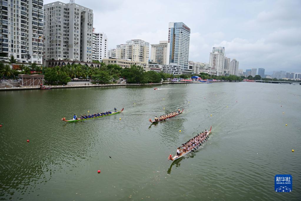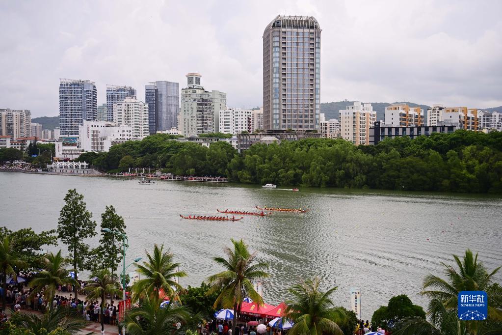6月18日,龍舟隊在海南省三亞市三亞河上進(jìn)行比賽。新華社發(fā)(沙曉峰攝)