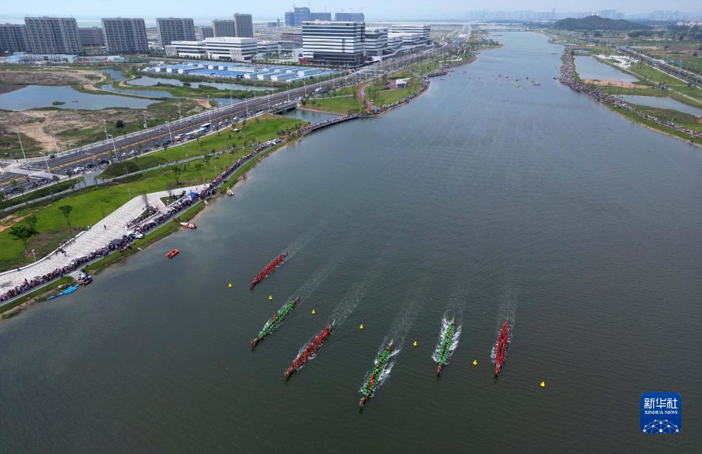 6月18日,龍舟隊在廣東汕頭澄海區(qū)海明公園參加賽龍舟活動(無人機(jī)照片)。新華社發(fā)(姚軍攝)