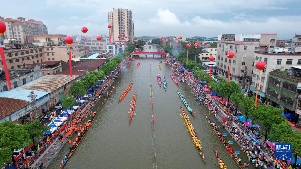 6月18日,龍舟隊在廣東省肇慶市高要區(qū)金利鎮(zhèn)西圍涌參賽(無人機(jī)照片)。新華社發(fā)(劉春林?jǐn)z)
