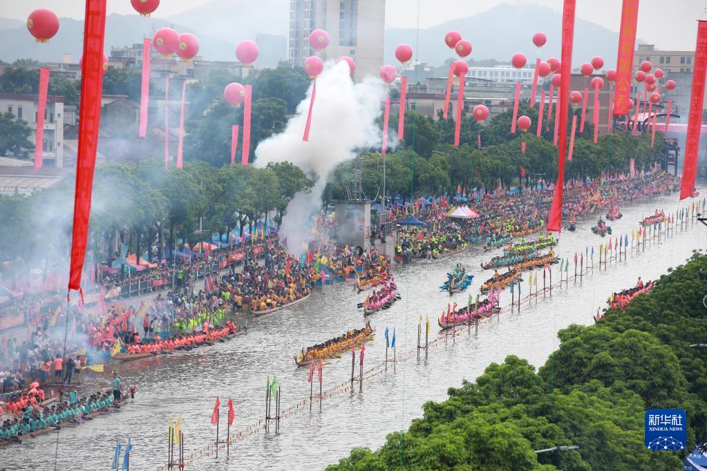 6月18日,龍舟隊在廣東省肇慶市高要區(qū)金利鎮(zhèn)西圍涌參賽。新華社發(fā)(劉春林?jǐn)z)