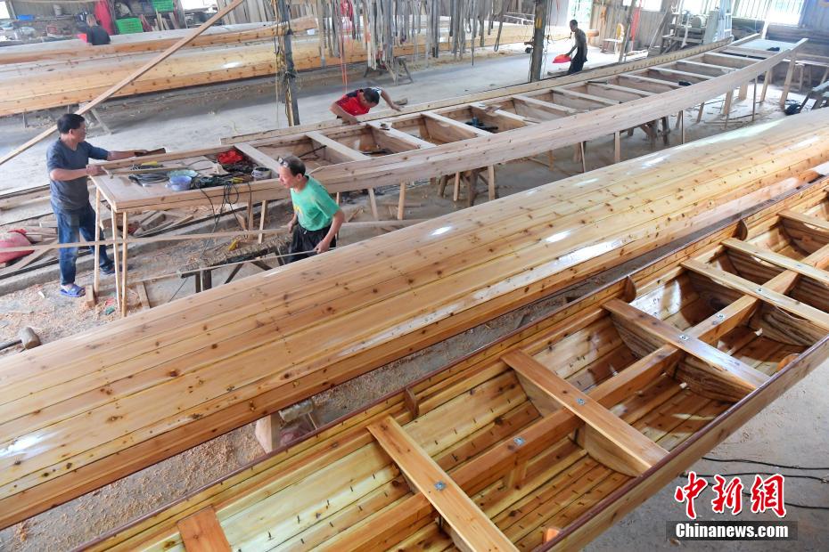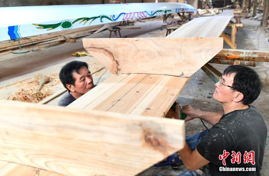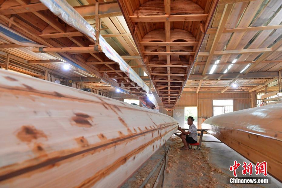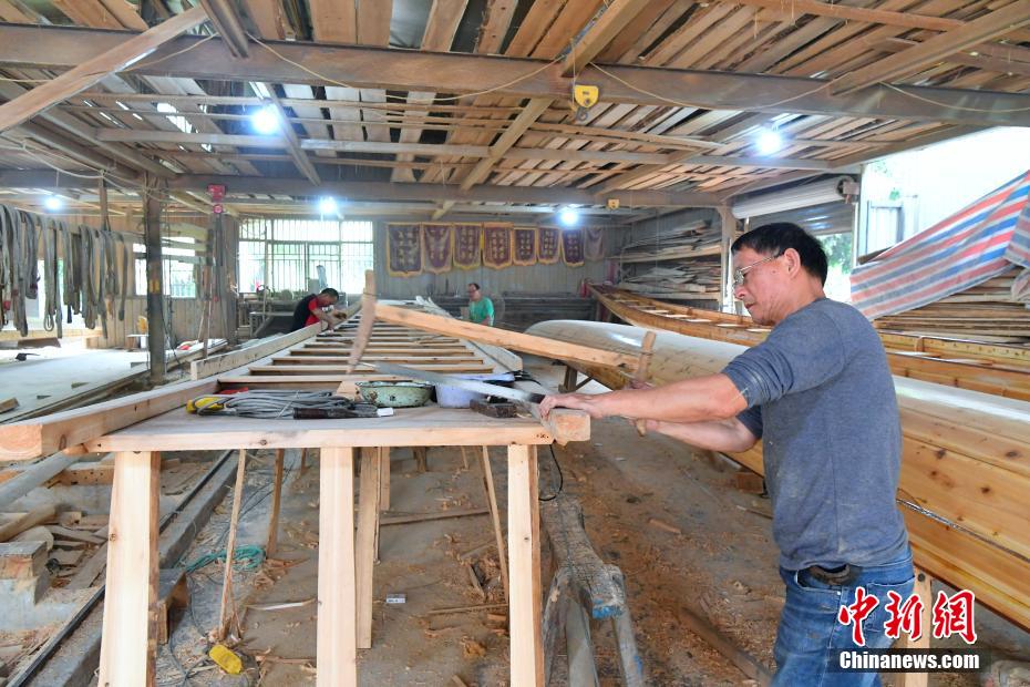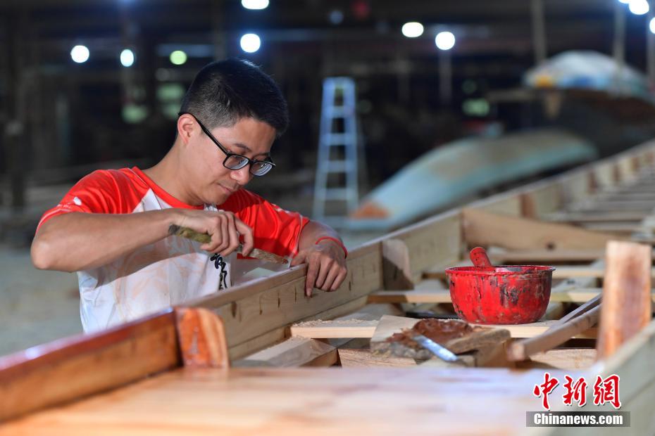 “世界龍舟看中國(guó),中國(guó)龍舟看福州,福州龍舟看方莊?!蔽挥诟=ㄊ「V菔虚}侯縣的方莊村,是中國(guó)最大的龍舟制造村,有著七百多年制作龍舟的歷史。隨著端午節(jié)臨近,方莊村內(nèi)的龍舟制造廠里,工匠們正加班加點(diǎn)趕制端午節(jié)的龍舟訂單。據(jù)統(tǒng)計(jì),目前該村每年能接到超過(guò)200艘龍舟的訂單,總產(chǎn)值約600萬(wàn)元人民幣。圖為5月25日,在方莊村的“龍舟世家”方忠雄龍舟廠里,“方莊龍舟制造技藝(閩侯縣)”第四代傳承人方劍偉在趕制端午節(jié)的龍舟訂單。中新社記者 張斌 攝