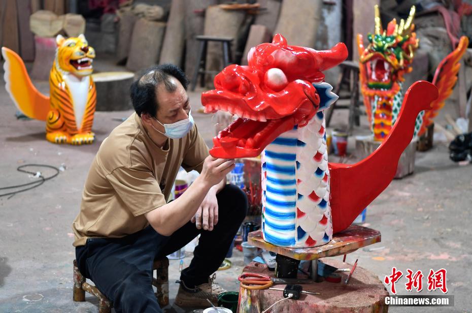“世界龍舟看中國(guó),中國(guó)龍舟看福州,福州龍舟看方莊。”位于福建省福州市閩侯縣的方莊村,是中國(guó)最大的龍舟制造村,有著七百多年制作龍舟的歷史。隨著端午節(jié)臨近,方莊村內(nèi)的龍舟制造廠里,工匠們正加班加點(diǎn)趕制端午節(jié)的龍舟訂單。據(jù)統(tǒng)計(jì),目前該村每年能接到超過(guò)200艘龍舟的訂單,總產(chǎn)值約600萬(wàn)元人民幣。圖為5月25日,在方莊村的一家龍舟龍頭制造廠里,師傅正在制作各式龍頭。中新社記者 張斌 攝