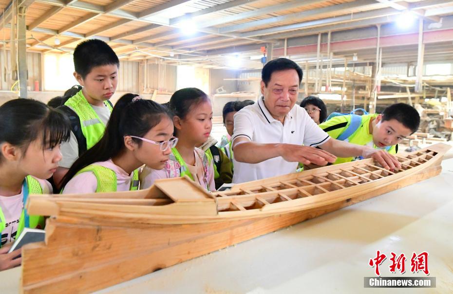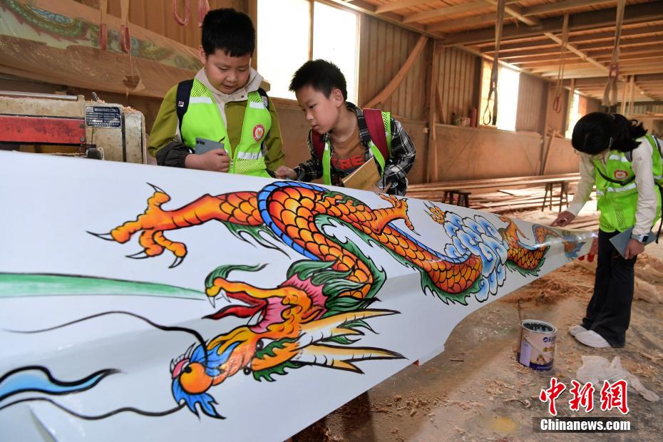 “世界龍舟看中國(guó),中國(guó)龍舟看福州,福州龍舟看方莊?!蔽挥诟=ㄊ「V菔虚}侯縣的方莊村,是中國(guó)最大的龍舟制造村,有著七百多年制作龍舟的歷史。隨著端午節(jié)臨近,方莊村內(nèi)的龍舟制造廠里,工匠們正加班加點(diǎn)趕制端午節(jié)的龍舟訂單。據(jù)統(tǒng)計(jì),目前該村每年能接到超過(guò)200艘龍舟的訂單,總產(chǎn)值約600萬(wàn)元人民幣。圖為5月25日,在方莊村的“龍舟世家”方忠雄龍舟廠里,前來(lái)參觀的小學(xué)生在了解傳統(tǒng)龍舟的制作工藝和過(guò)程。中新社記者 張斌 攝