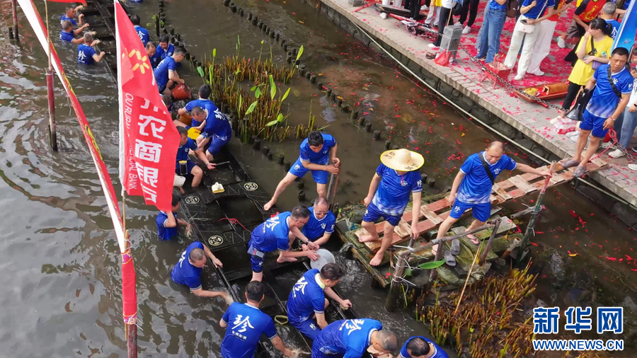 “起龍”是為即將到來的龍舟比賽做好準備。新華網(wǎng)發(fā)(鐘璟 攝)