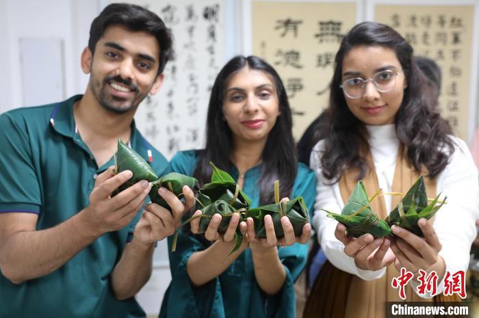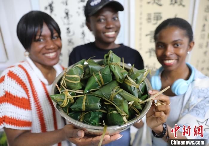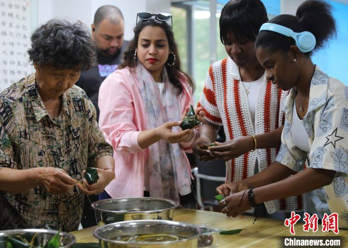 5月27日,在河北省秦皇島市海港區(qū)白塔嶺街道燕大西苑社區(qū),當(dāng)?shù)赝鈬?guó)留學(xué)生相聚一堂,通過包粽子、體驗(yàn)?zāi)景婺戤嫷确绞?,沉浸式體驗(yàn)中華文化的魅力。