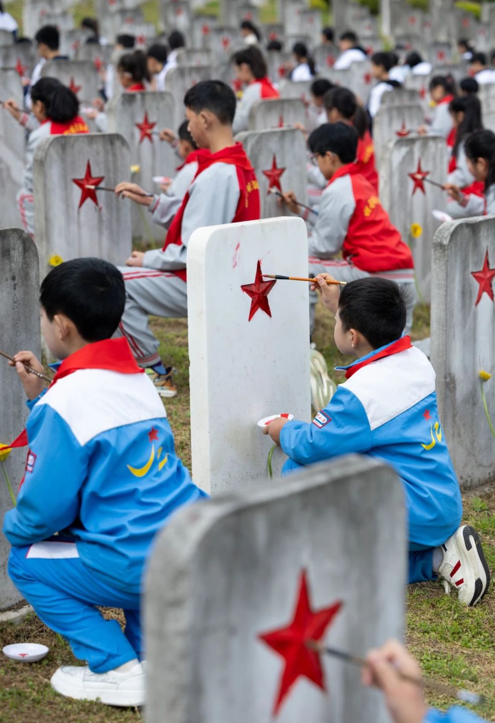 3月31日,在川陜革命根據(jù)地紅軍烈士陵園,通江縣沙溪初級(jí)中學(xué)和沙溪鎮(zhèn)中心小學(xué)的學(xué)生們一筆一畫(huà)地為無(wú)名烈士碑身上的五角星描紅。新華每日電訊記者江宏景攝