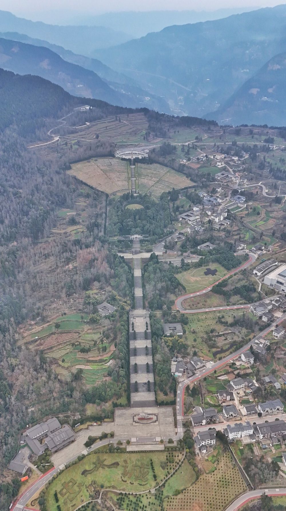 陵園依山就勢(shì)而建,沙溪河蜿蜒環(huán)繞,從空中俯瞰如一把火炬鑲嵌在青山綠水間。“火炬柄”是被稱為“千秋大道”的341級(jí)臺(tái)階,“火炬身”是核心墓區(qū),呈扇形分布的無(wú)名烈士陵園區(qū)則猶如熊熊火焰。