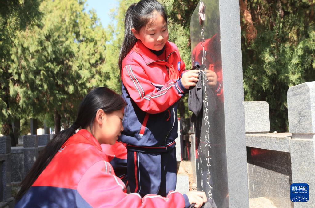 4月2日,山東省臨沂市平邑縣武臺(tái)鎮(zhèn)中心小學(xué)學(xué)生在武臺(tái)鎮(zhèn)烈士陵園擦拭烈士墓碑。