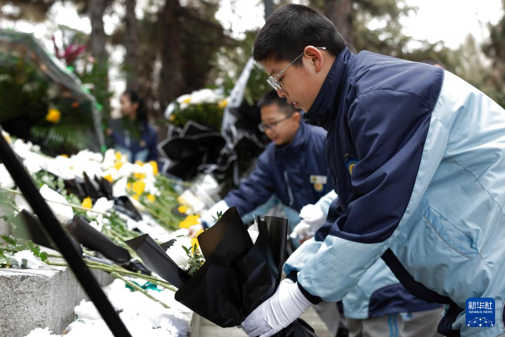4月2日,學(xué)生在山東省滕州市烈士陵園向烈士敬獻(xiàn)鮮花。