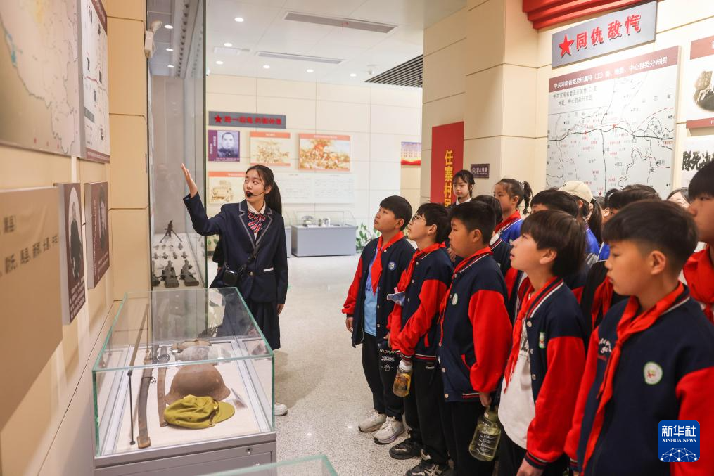 4月2日,講解員在河南省平頂山市寶豐革命紀(jì)念館為學(xué)生講述抗戰(zhàn)歷史。