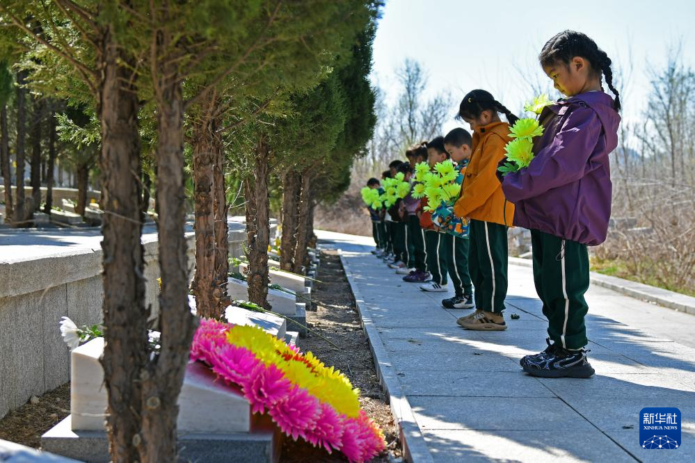 4月2日,河南省濟(jì)源市太行路學(xué)校學(xué)生在烈士陵園向革命先烈敬獻(xiàn)鮮花。