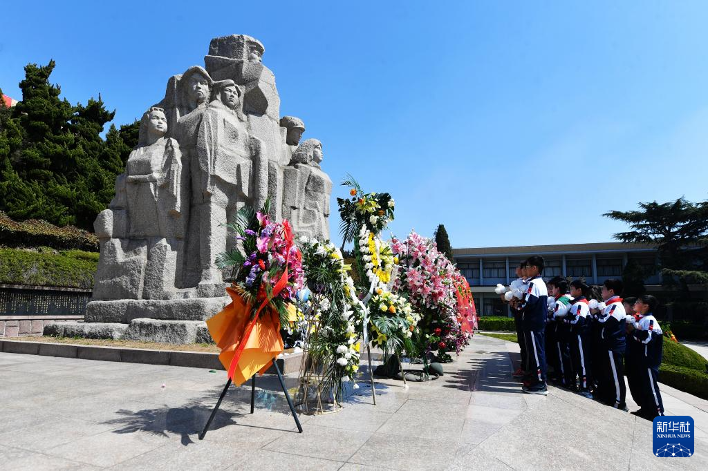 4月2日,山東省青島市市北區(qū)普新小學(xué)學(xué)生在革命烈士雕塑前獻(xiàn)花致敬。