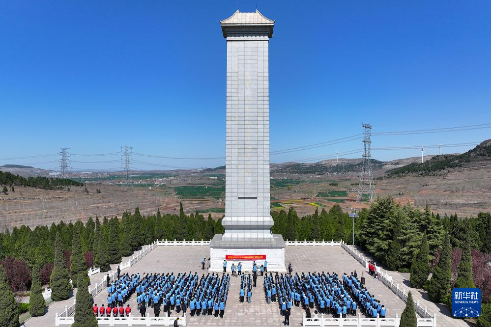 4月2日,人們?cè)诤幽鲜∑巾斏绞袑氊S縣烈士陵園革命烈士紀(jì)念碑前緬懷先烈(無人機(jī)照片)。