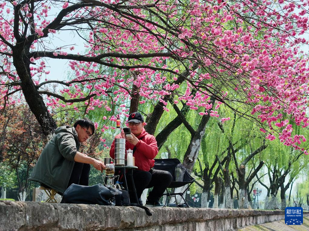4月1日,游客在河南省洛陽市汝陽縣蔡店鄉(xiāng)杜康村杜康造酒遺址公園賞花觀光。