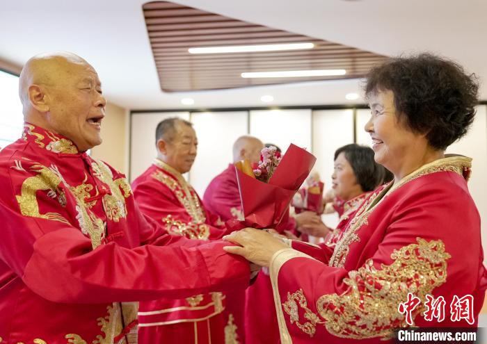 七夕將至,河北省邯鄲市老人走進(jìn)叢臺(tái)區(qū)光明橋街道天璽苑社區(qū),參加“七夕迎金婚 共創(chuàng)好家風(fēng)”慶典,回憶半個(gè)世紀(jì)的愛情。金婚慶典儀式經(jīng)過牽手入場、夫妻對拜、執(zhí)子之手、回憶往昔等環(huán)節(jié),見證了金婚夫妻們相濡以沫、互敬互愛的美滿婚姻。金婚老人結(jié)合親身經(jīng)歷,分享家風(fēng)家訓(xùn)及愛情故事,講述家庭幸福的秘訣,“曬”出婚姻保鮮的秘籍,分享婚姻的經(jīng)營智慧。圖為8月6日,丈夫?yàn)槔习閮韩I(xiàn)鮮花。王倩倩 攝