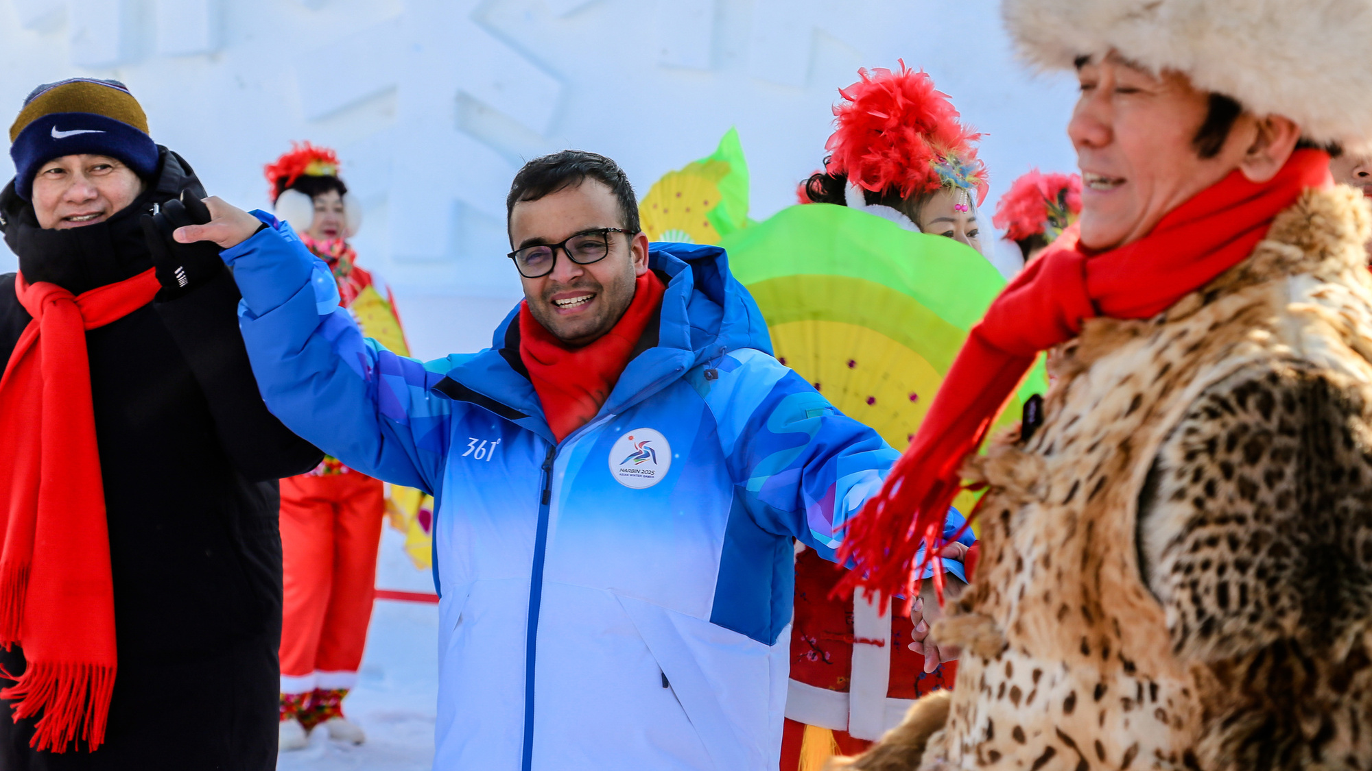 第九屆亞冬會(huì)在哈爾濱舉辦期間,一場(chǎng)主題為“當(dāng)亞冬會(huì)遇上非遺年——亞洲多國(guó)人士冰城同慶新春”的人文交流活動(dòng)在哈爾濱舉行?;顒?dòng)當(dāng)天,在哈爾濱雪博會(huì)中央廣播電視總臺(tái)演播室前的廣場(chǎng)上,20多人組成的民間秧歌隊(duì)在哈爾濱中央大街形象大使甲繼海的帶領(lǐng)下,為各國(guó)來賓激情演繹迎賓秧歌舞。