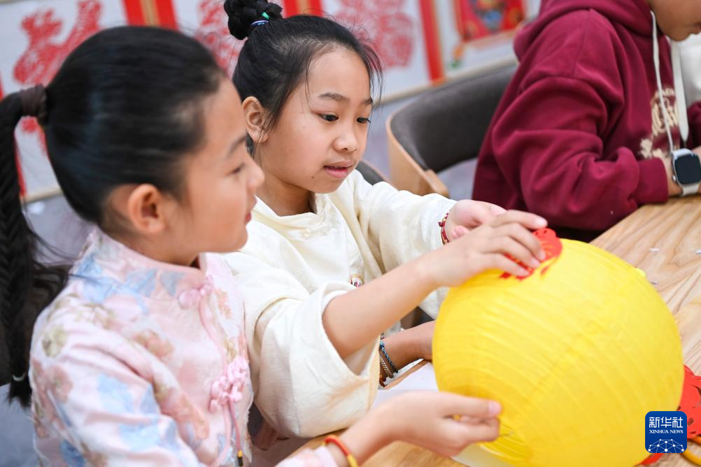 2月7日,在廣西興業(yè)縣文化館,小朋友在制作燈籠。新華社記者 曹祎銘 攝