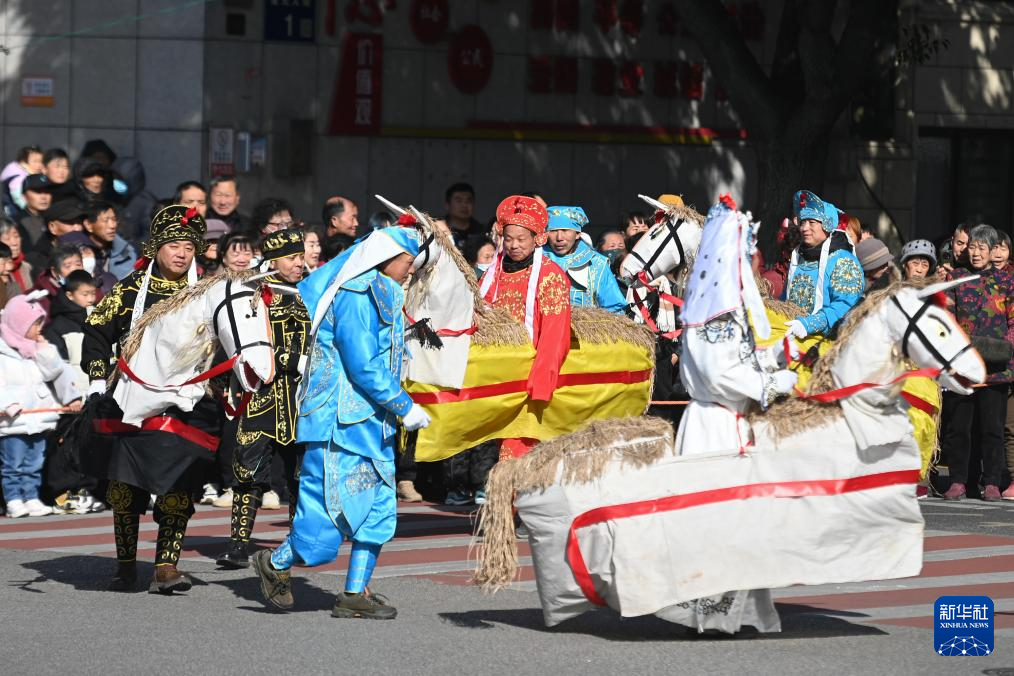 2月8日,鄉(xiāng)村馬燈隊在南潯區(qū)和孚鎮(zhèn)街區(qū)上巡游表演。