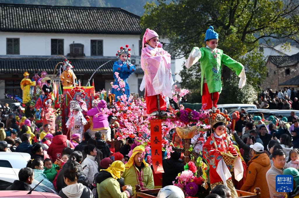 2月10日,浙江省武義縣俞源古村舉行“擎臺(tái)閣”迎元宵大型民俗展演活動(dòng),童男童女扮演的戲曲人物在村中巡游。