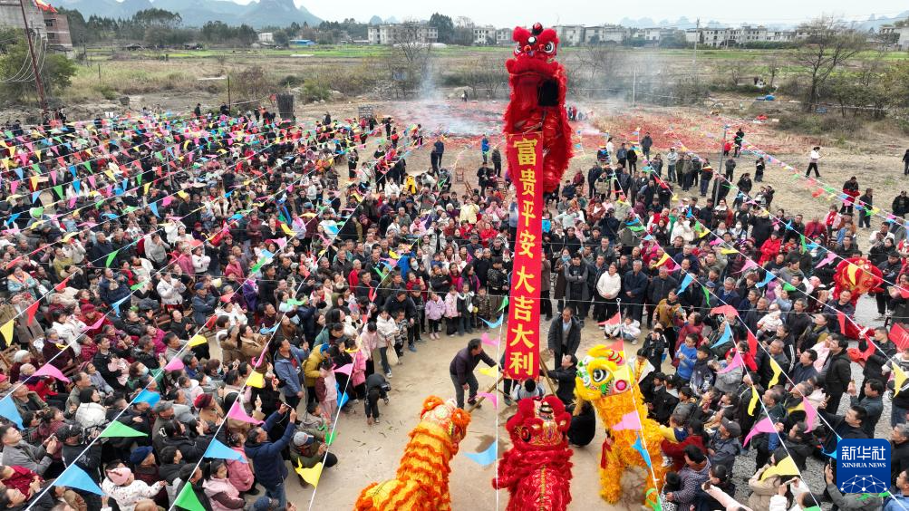 2月9日,廣西柳州市柳江區(qū)進(jìn)德鎮(zhèn)四連村土垢屯,村民在客家“上燈節(jié)”活動(dòng)上進(jìn)行舞獅表演(無人機(jī)照片)。