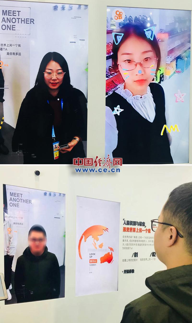 在茫茫人海之中找到與自己長(zhǎng)相相似的人,就如大海撈針一般。在快手展臺(tái)上,記者體驗(yàn)了一回找到另一個(gè)自己的感覺,站在攝像頭前,倒計(jì)時(shí)3s后,左右兩塊屏幕上就分別出現(xiàn)了自己剛剛拍攝的照片和一個(gè)與自己長(zhǎng)相非常相似的人。王婉瑩/攝