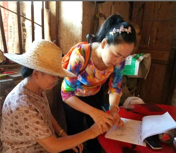 余芬初次入戶走訪時(shí),吳仁芬五十余歲的兒子周光文正蹲在屋門前撿路人的煙頭抽,對(duì)旁人的關(guān)心毫不理睬。年邁的老人、呆滯的兒子、艱苦的生活條件讓余芬在今后的幫扶工作中對(duì)吳仁芬一家格外上心?!斑@個(gè)家特別困難,余芬擔(dān)任吳仁芬家?guī)头鲐?zé)任人后,就像女兒一樣跑前跑后。”李正剛說。不計(jì)其數(shù)的走訪和關(guān)心讓智力低下的周光文也深深記住了她?!坝啻蠼銓?duì)我好...好...”當(dāng)問起余芬時(shí),周光文正在地上用手指劃著自己的名字,這是余芬手把手教他的三個(gè)字,也是周光文唯一會(huì)寫的三個(gè)字。