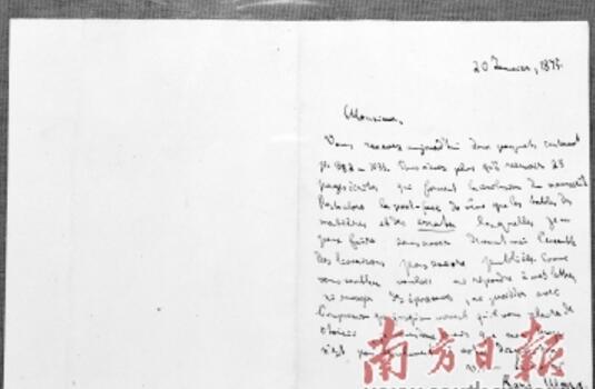 馬克思1875年1月20日致路易·朱斯坦·拉于爾的書信(手稿)。