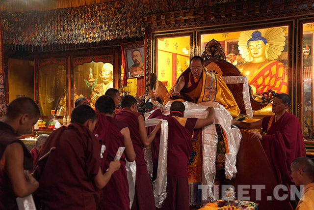 十一世班禪頭戴金色佛冠,由手持香炷的僧人引領(lǐng),緩緩步入杜康大殿。在僧人們渾厚的誦經(jīng)聲中,十一世班禪登上法座,領(lǐng)誦經(jīng)文。寺廟僧人向十一世班禪敬獻曼扎等,十一世班禪微笑接過后,為僧人摸頂賜福,并發(fā)放布施、供齋茶齋飯。隨后,十一世班禪朝拜珍珠唐卡殿。