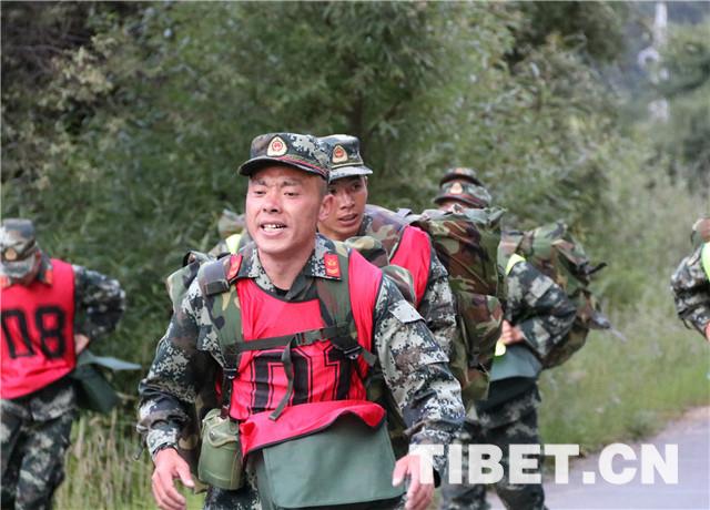 圖為藏族班長(zhǎng)覺(jué)次仁,一人肩扛兩個(gè)背囊,“飛奔”在五公里武裝越野比武考核的路上。