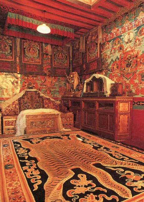 公元七世紀初,今西藏南部雅魯藏布江流域的吐蕃王國崛起,松贊干布(617-650年)于630年登贊普位。他頒布了新律法《三十六制》。其中六種告身中提到了善號和惡號六種,“以虎豹皮譽英雄,狐尾以表懦夫”;六種標志中提到“震懾敵人英雄相的標志中各位英雄身著虎皮戰(zhàn)袍”;六種褒獎中提到,對大臣和有功人員的獎勵包括,“侍身本教師與侍寢官、羌塘堪輿師(即風水師)、邊防哨兵、城堡警衛(wèi)為小銀書”;六種勇飾包括虎皮褂、虎皮裙、大麻袍、小麻袍、虎皮袍、豹皮袍。松贊干布的這一律法直接影響了后世對虎皮紋地毯的使用。