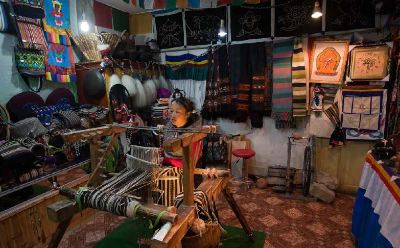 店內(nèi)的款式多樣、設(shè)計(jì)新穎、做工精細(xì)的背包、挎包、圍巾、毛毯等,簡直是拉薩民間手工編織工藝品的大集合,珠杰的小女兒正在編織氆氌。