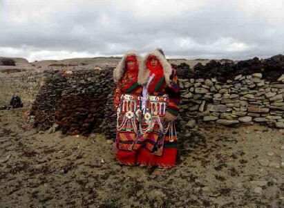 瑪旁布姆卡是西女國女王居住的城堡,普蘭縣文化局局長加措根據(jù)藏文大字典和《阿里史地探秘》的“瑪旁布莫卡”,解釋出“布”的漢文詞義,就是女人、女性、女子或者女王?!澳本褪窍悴莼蛘呦悴荼椴即松健?jù)當?shù)匕傩战榻B,城堡遺址坐落在普蘭神湖瑪旁雍措湖的東部扎藏布溫泉溝南側(cè)的野嶺上,海拔5000米上下。在遺址上部高處還有一個碩大蘑菇形狀的巖石巋然迎風屹立城堡上方,與下方城堡遺址交相輝映。這即是“出俞石、朱砂、麝香、牦牛、駿馬、蜀馬,尤多鹽,恒將鹽向天竺興販,其利數(shù)倍”西女王國的王城。在城堡上方更高處的山后,遺留有眾多的洞穴,說明女國的百姓就居住在女王的周圍。此外在山坡的下方扎藏布溝處,當?shù)匕傩辗Q這塊地方為“卡爾青”,意思是大城堡之地。盡管史書上的記載十分有限,瑪旁布姆卡的故事仍然世世代代流傳在當?shù)匕傩盏男闹?。霍爾村一位年邁的老百姓告訴筆者,溫泉溝和曲古寺廟附近就有許許多多女王的傳說,聽說女王曾經(jīng)在此沐浴,但不知具體在什么地方。