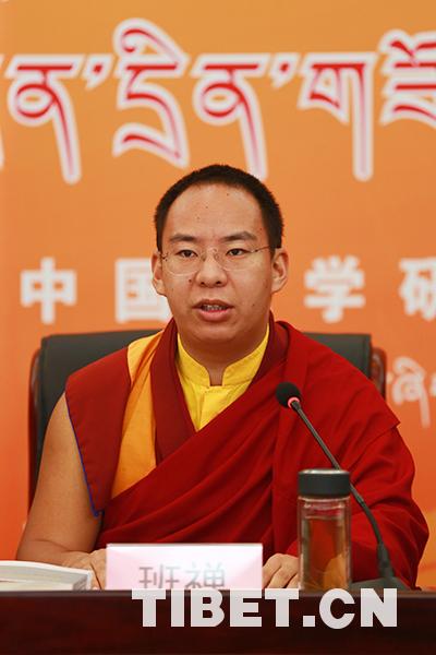 中國(guó)佛教協(xié)會(huì)副會(huì)長(zhǎng)班禪額爾德尼·確吉杰布在教義闡釋研討會(huì)上作主旨發(fā)言。 圖/許娜