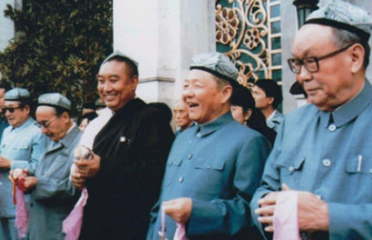 圖為習(xí)仲勛(右二)與烏蘭夫(右一)、十世班禪(右三)、賽福鼎o艾則孜(右四)、楊靜仁(右五)在北京民族文化宮。圖片來(lái)源:《中國(guó)西藏》雜志