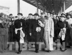 1951年4月27日,十世班禪首次進(jìn)京,周恩來總理、朱德總司令等黨和國家領(lǐng)導(dǎo)人前往北京火車車站迎接。