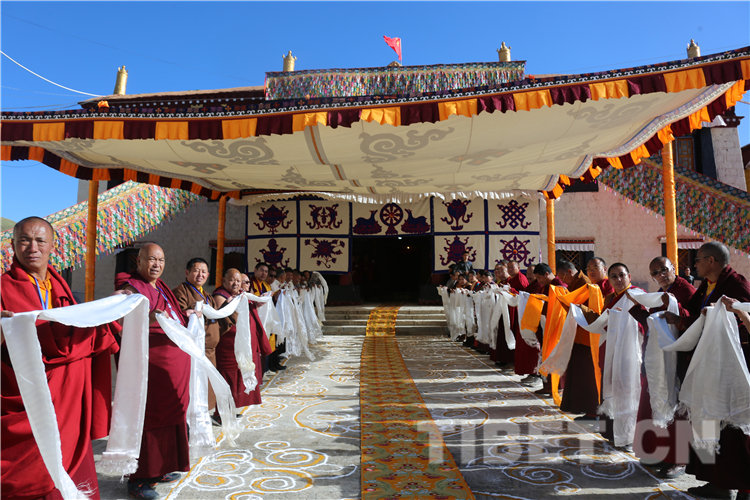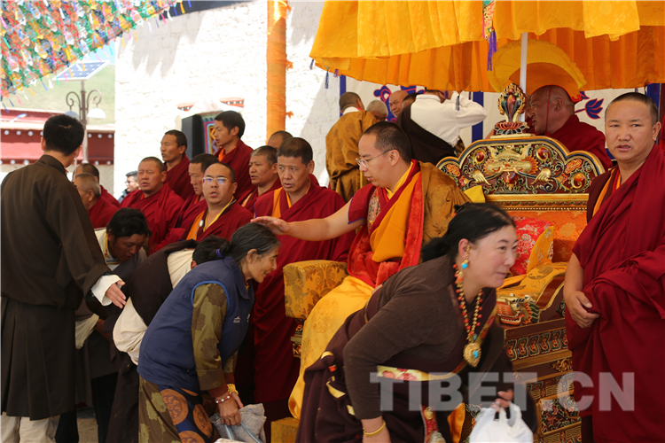 那曲市孝登寺由活佛洛桑尊珠?丹白嘉措始建,距今已近200年歷史。8月9日,十一世班禪前往孝登寺禮佛朝拜,抵達(dá)孝登寺后,珠康?土登克珠活佛向十一世班禪敬獻(xiàn)哈達(dá)。隨后,十一世班禪登上寶座帶領(lǐng)僧眾集體誦經(jīng)祈福,為寺廟僧眾和早早在此等候的信教群眾舉行長(zhǎng)壽灌頂、摸頂賜福,為僧俗信眾發(fā)放長(zhǎng)壽金剛結(jié)、長(zhǎng)壽丸等。