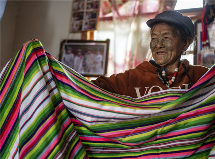 2019年4月21日,云南省貢山獨(dú)龍族怒族自治縣獨(dú)龍江鄉(xiāng)迪政當(dāng)村獨(dú)龍族婦女李文仕在家里展示她親手織的獨(dú)龍?zhí)骸T颇鲜?019年宣布,獨(dú)龍族、德昂族、基諾族3個(gè)“直過民族”實(shí)現(xiàn)整族脫貧,歷史性告別絕對(duì)貧困。新華社記者 江文耀 攝