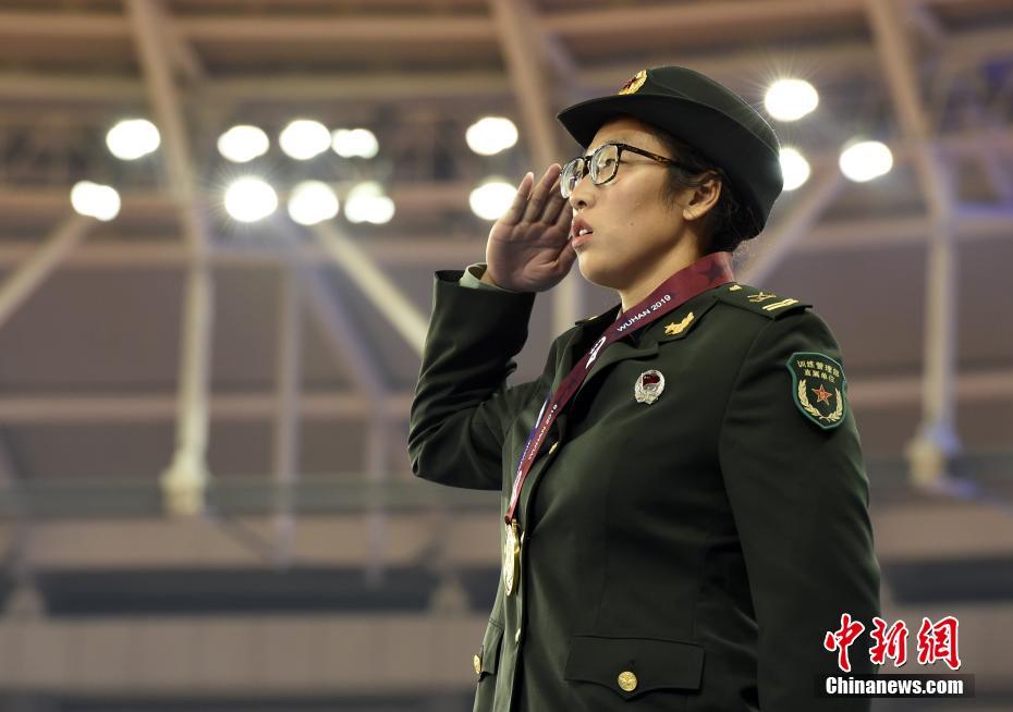 10月24日晚,第七屆世界軍人運(yùn)動(dòng)會(huì)女子鐵餅決賽在湖北省武漢市舉行,中國(guó)選手馮彬以64米83奪得冠軍。圖為馮彬在頒獎(jiǎng)儀式上。中新社記者 侯宇 攝
