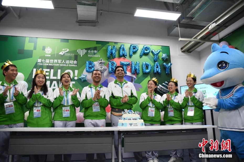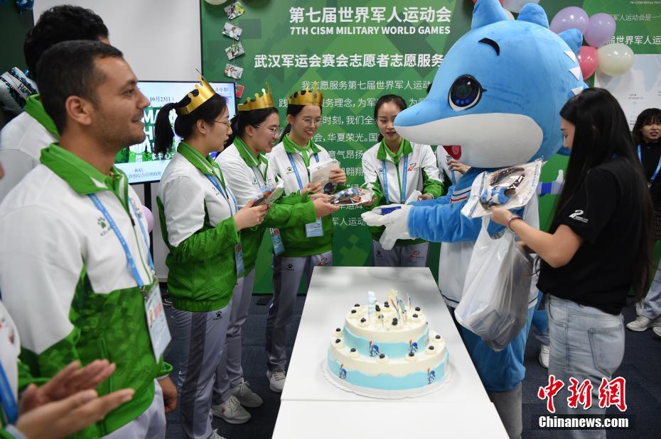 10月24日,幾位在第七屆世界軍人運(yùn)動(dòng)會(huì)舉辦期間迎來(lái)生日的志愿者“小水杉”在主媒體中心內(nèi)的“志愿者之家”過(guò)集體生日。圖為軍運(yùn)會(huì)吉祥物“兵兵”向過(guò)生日的志愿者們送上小禮物。中新社記者 侯宇 攝