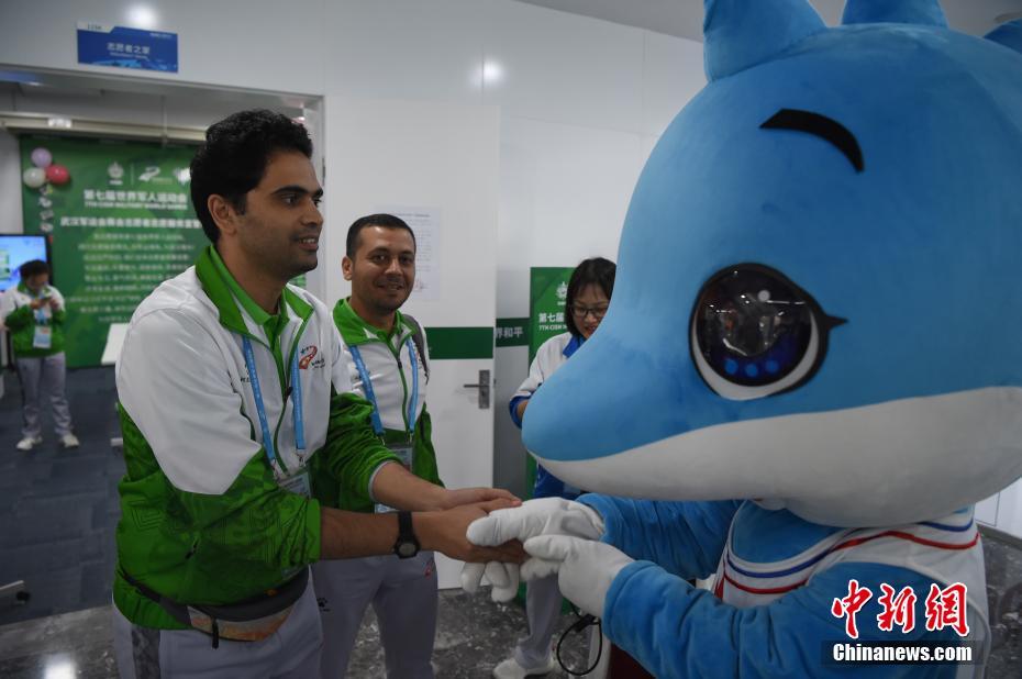 10月24日,幾位在第七屆世界軍人運(yùn)動(dòng)會(huì)舉辦期間迎來(lái)生日的志愿者“小水杉”在主媒體中心內(nèi)的“志愿者之家”過(guò)集體生日。圖為來(lái)自埃及的志愿者艾爾侯賽因與軍運(yùn)會(huì)吉祥物“兵兵”交流。中新社記者 侯宇 攝