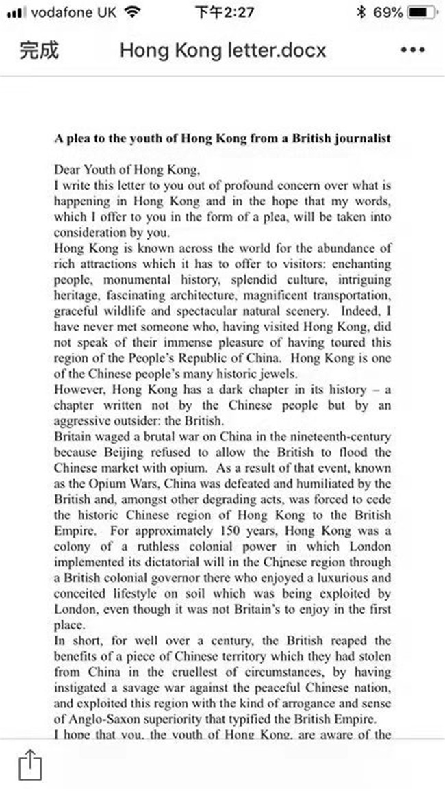 香港的中國青年,我呼吁你們保護你們的地區(qū)不受殖民主義的影響,在這樣做的同時,捍衛(wèi)中華人民共和國的獨立、主權(quán)和領(lǐng)土完整。我呼吁你們,要確保你們的先人在鴉片戰(zhàn)爭期間在英國人那里經(jīng)受的苦難不至于白白承受。讓先輩遭受的苦難,成為你們保衛(wèi)祖國的愛國主義和靈感的源泉吧。