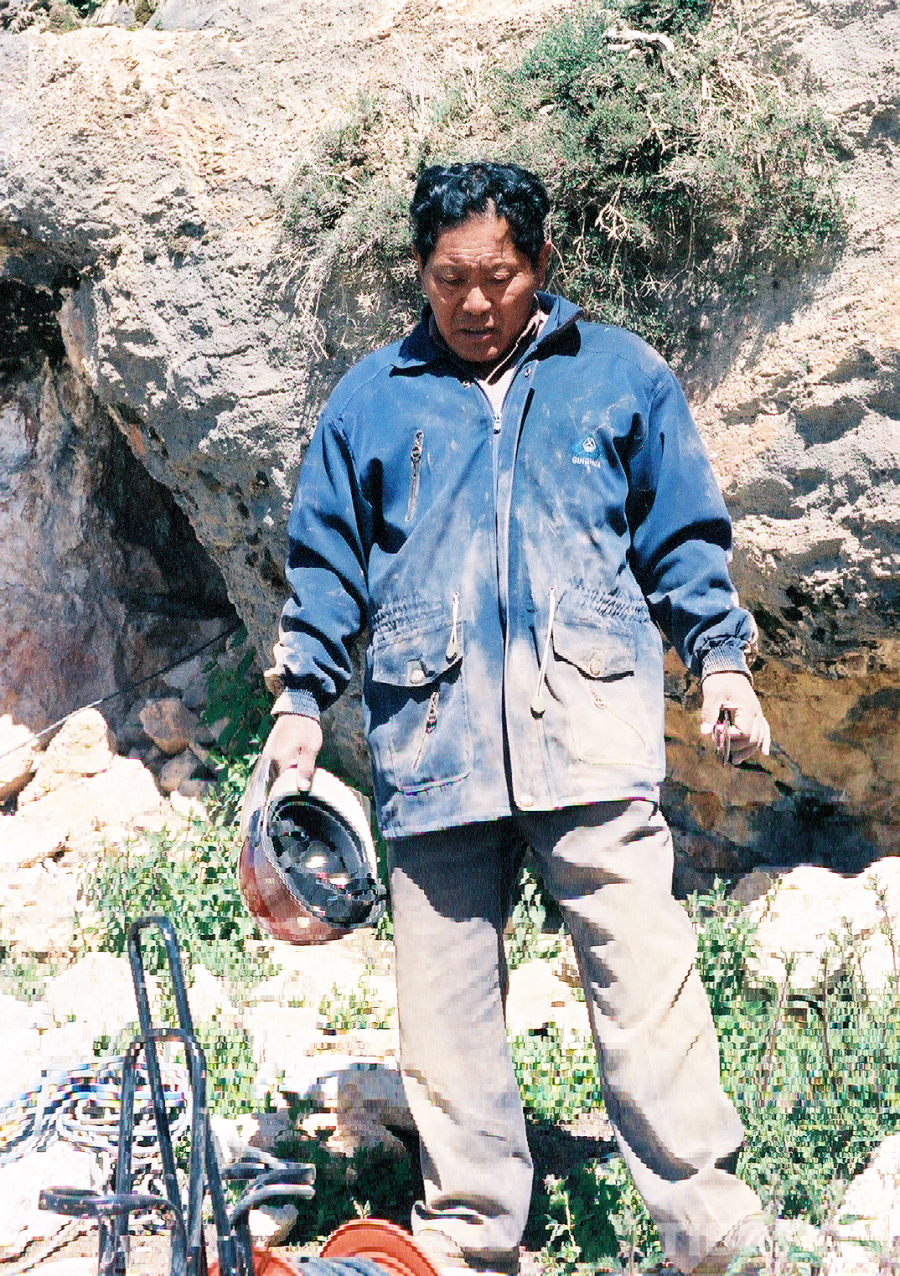 這是率隊(duì)在藏北無人區(qū)科考中,時(shí)任西藏人大常委會(huì)副主任洛桑丹珍搶著去身后狹小的洞里去探洞。當(dāng)爬出洞時(shí),全身沾滿了泥土(唐召明2001年7月6日攝)