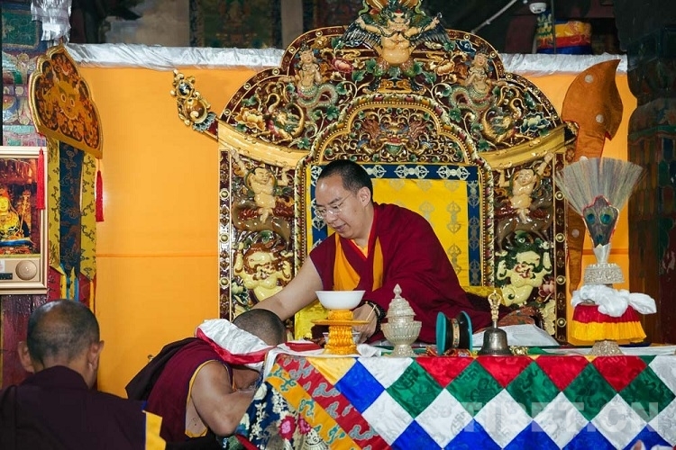 圖為十一世班禪為仁青崩寺僧眾摸頂 攝影:鄭朔