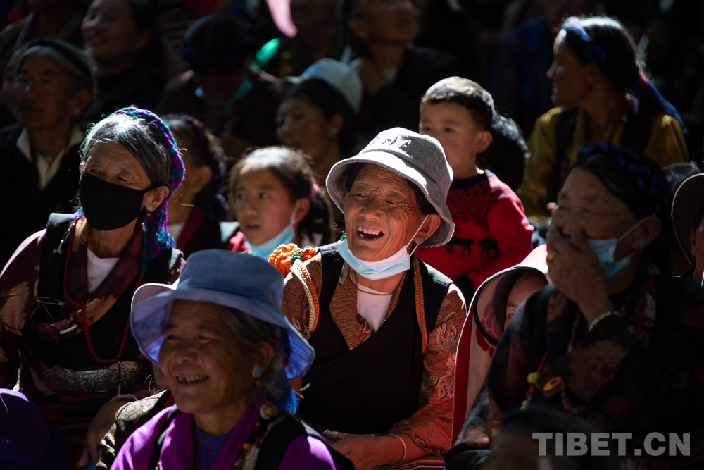偌大的空地上早早坐滿了前來觀看“跳神”表演的僧俗信眾,身著傳統(tǒng)藏裝的他們?cè)缭缵s來,只為“搶占”有利位置朝拜十一世班禪、觀看“跳神”。上午10時(shí)許,“跳神”儀式正式開始。