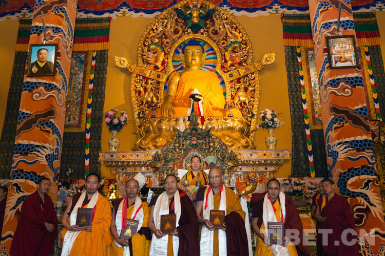 圖為十一世班禪在日喀則市薩迦縣西藏佛學(xué)院薩迦寺分院為高僧頒發(fā)“然講巴”學(xué)位證書 攝影:鄭朔