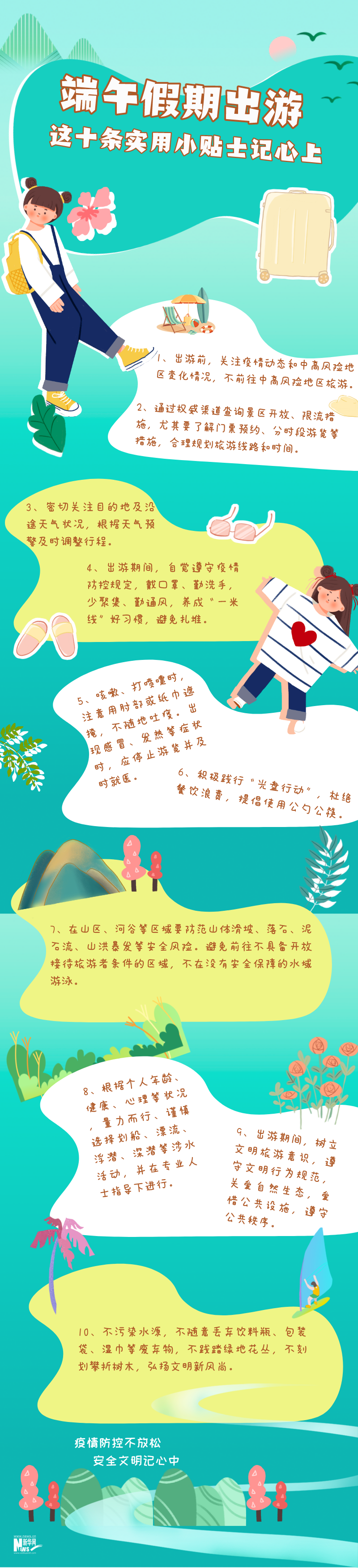 端午節(jié)假期將至,人員流動(dòng)增多,在落實(shí)常態(tài)化疫情防控的前提下,對(duì)于有出游安排的旅客,如何在出游期間做到疫情防控不放松,安全文明記心中?這十條實(shí)用小貼士請(qǐng)收下。